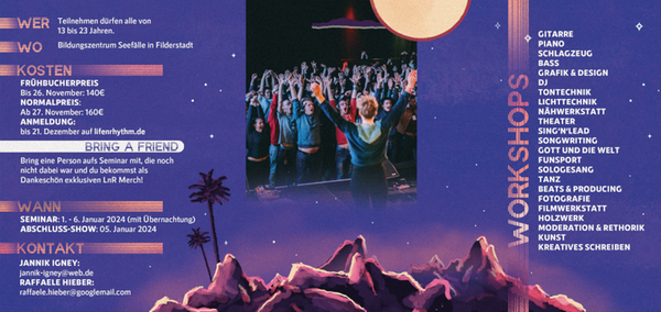 Aus der musisch-kulturellen Jugendarbeit von TEN SING ist das Programm life´n´rhythm entstanden. Bei life’n’rhythm erleben 150 Jugendliche zwischen 13 und 23 Jahren eine Woche lang eine einzigartige, lebensverändernde, tiefgehende und lockerleichte Zeit. Das Seminar bietet: